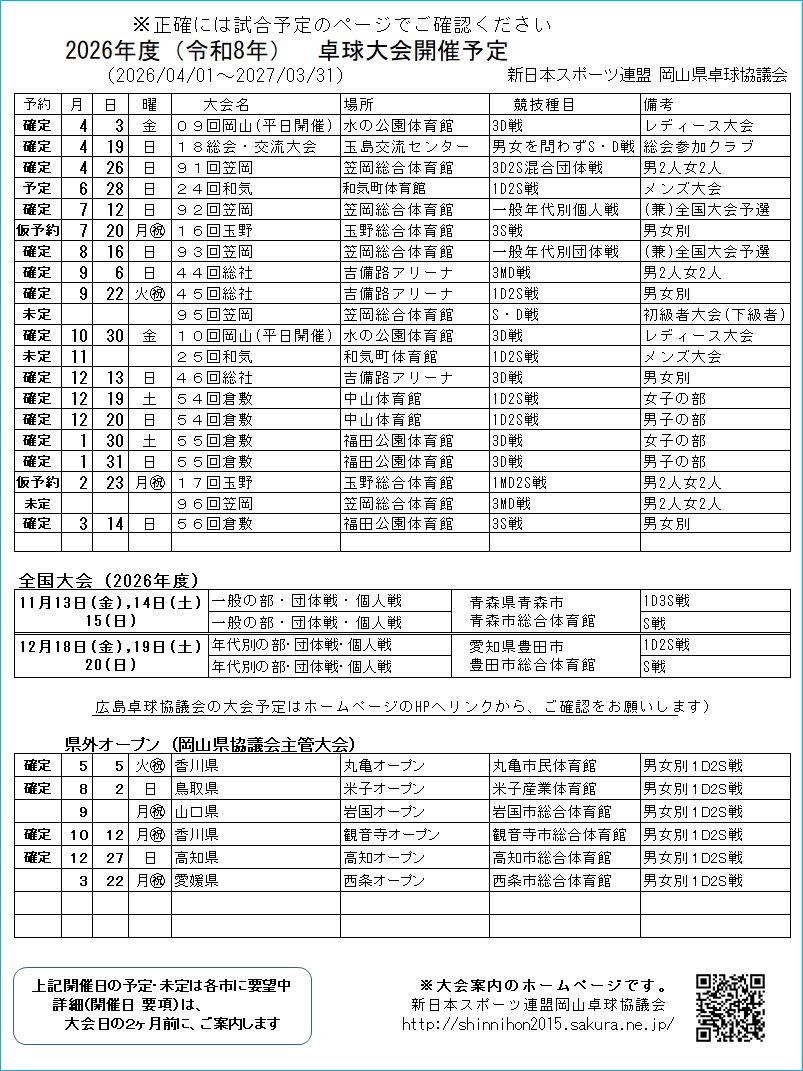 | 新日本スポーツ連盟岡山県卓球協議会 事務局のお知らせ |