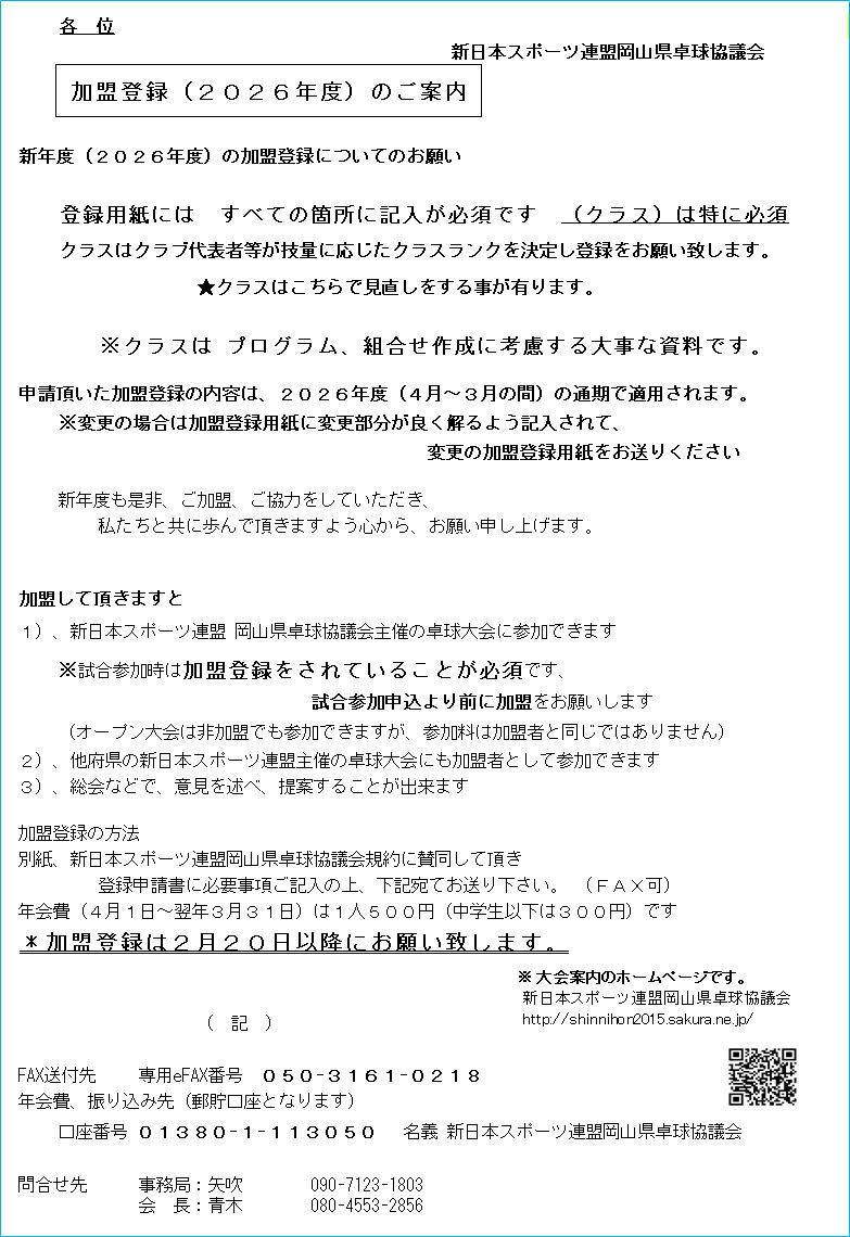 2026年度 新日本スポーツ連盟岡山卓球協議会の加盟登録のご案内です