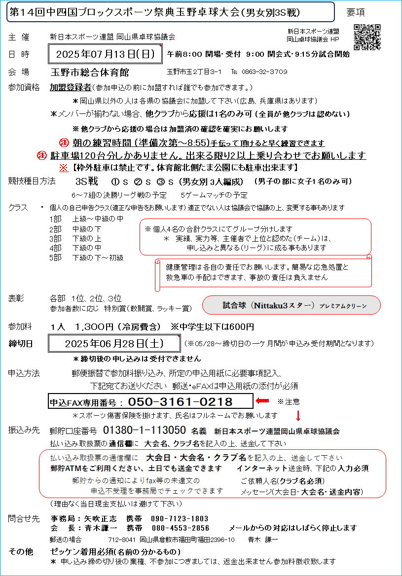 試合予定2025/07/13 新日本スポーツ連盟岡山卓球協議会