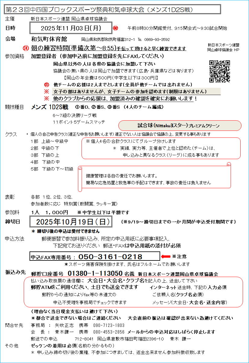 試合予定2025/11/03 新日本スポーツ連盟岡山県卓球協議会