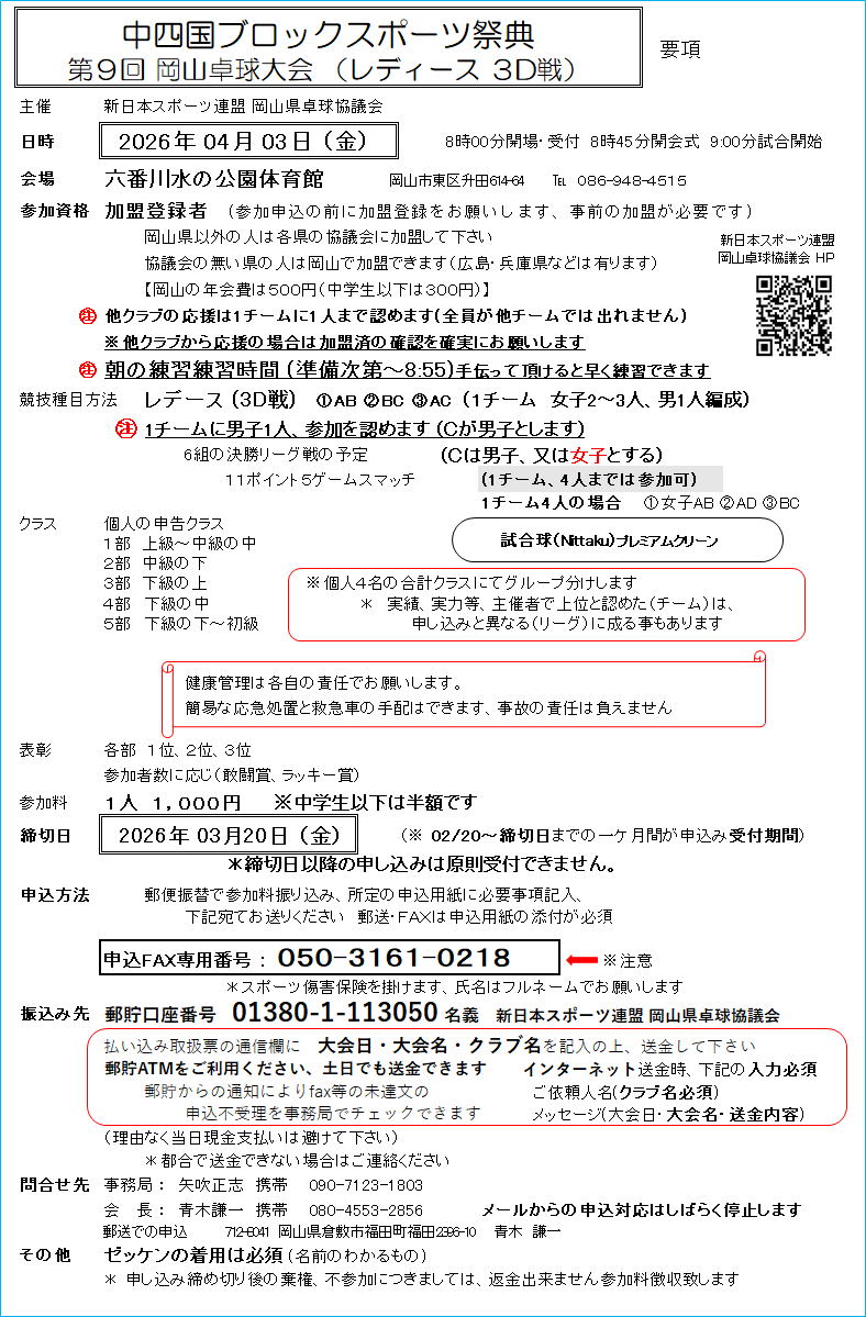 試合予定2026/04/03 新日本スポーツ連盟岡山卓球協議会