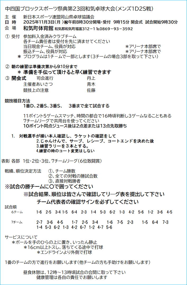 試合結果2025/11/03 新日本スポーツ連盟岡山卓球協議会