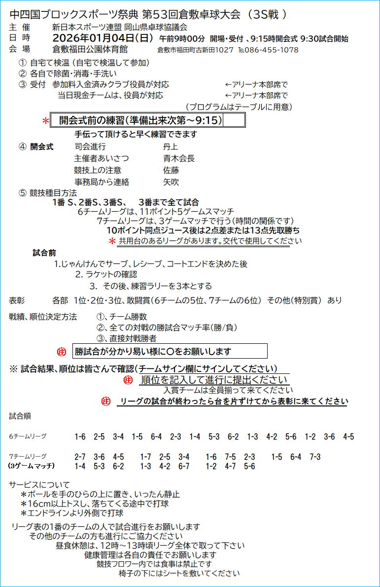 2026年01月04日(日)倉敷卓球大会の試合結果