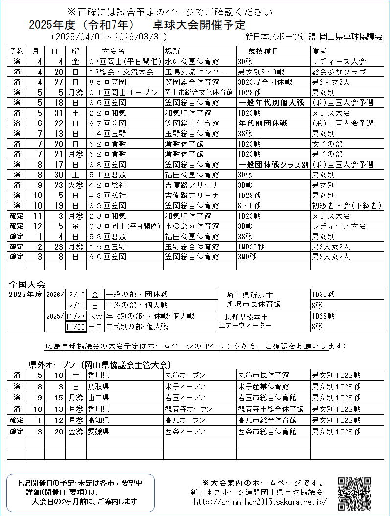 新日本スポーツ連盟岡山県卓球協議会 事務局のお知らせ |