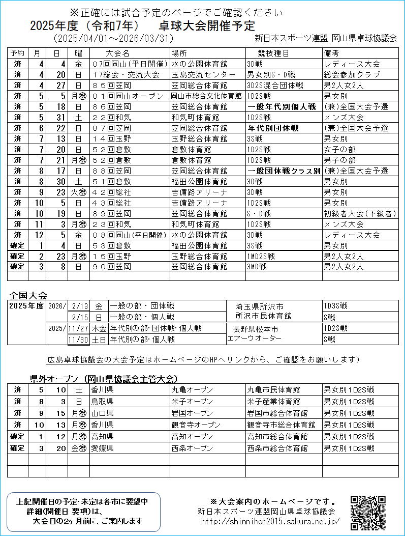 | 新日本スポーツ連盟岡山県卓球協議会 事務局のお知らせ |